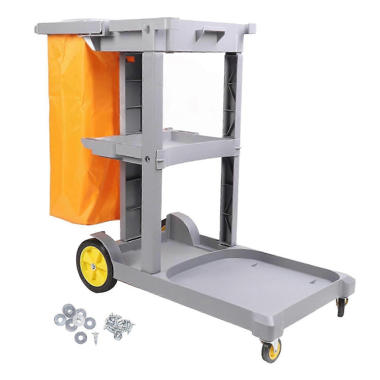 Feature:1. MULTI FUNCTIONAL: Use our multifunctional cleaning cart to organize your cleaning work and improve efficiency. The three layer frame design ensures a well organized cleaning tool. The platform base provides sufficient space to place buckets or cleaning supplies. The hooks on both sides can accommodate long pole tools such as brooms, mops, and bulletin boards.2. EASY TO MOVE: Equipped with two 360 universal front casters, two stable rear wheels, and a wide handle, you can easily push the cleaning car with wheels.3. APPLICABLE SCENARIO: Quickly clean all garbage from offices, hotels, airports, apartments, and other places.4. EASY TO CLEAN AND STORE: Simply place two iron rods together with the middle platform to assemble or disassemble, saving time and space.5. PLASTIC MATERIAL: Made of premium plastic material, the cart is strong and sturdy, wear resistant and scratch resistant, ensures a long service life.Specification:Item Type: Janitorial CartMaterial: PlasticColor: Grey with coverFeatures: Made of premium thickened engineering plastic, with a smoothly texture and bright and glossy colors, suitable for various scenes such as subways, supermarkets, hotels, shopping malls, etc. It can be disassembled, wheels are flexible, and functions are complete.Package List:8 x Assembly Accessories 1 x Bag 1 Package x Parts 1 x Manual