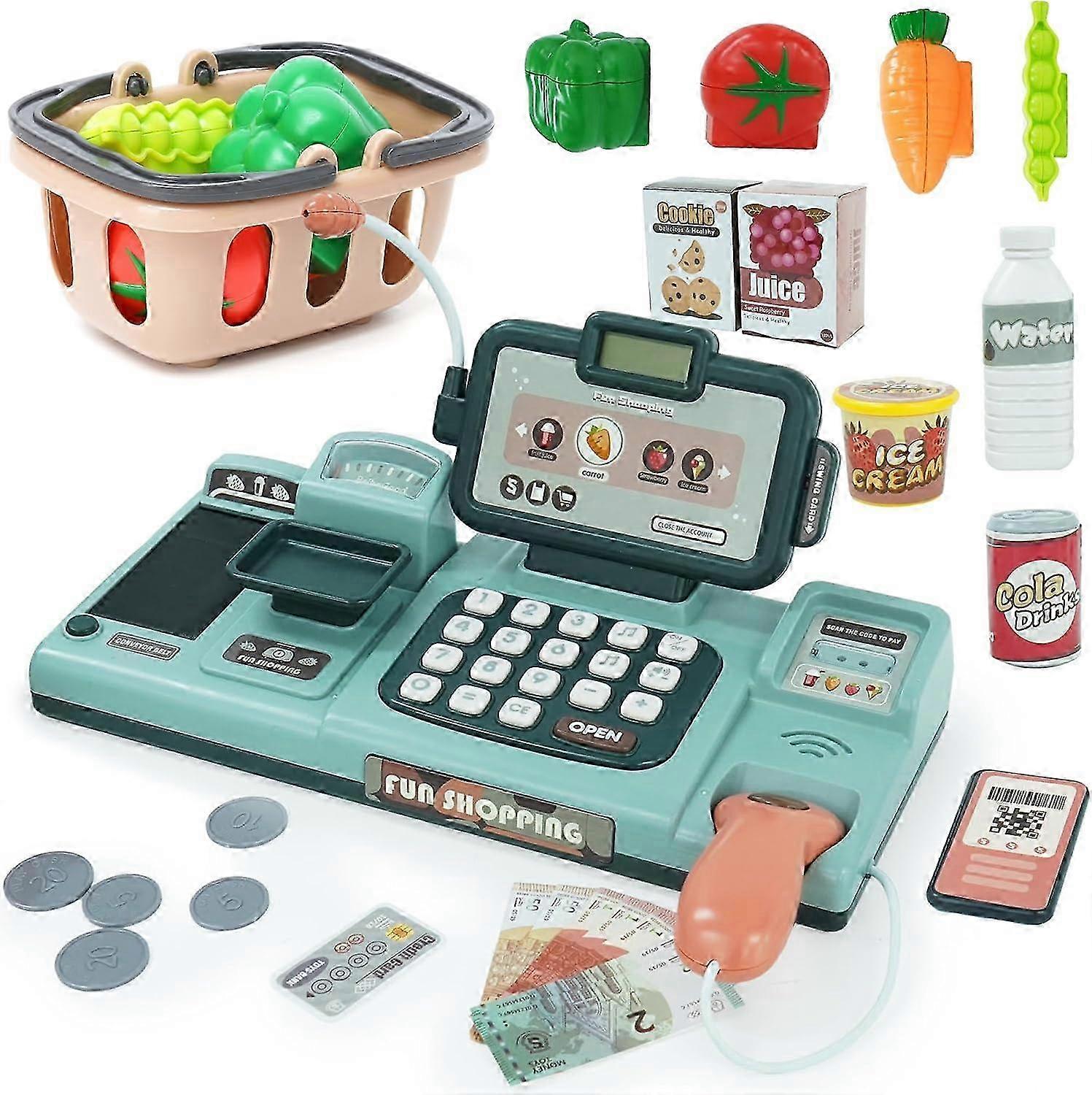 Cash Register Toy For Kids With Scanner, Sound, Food, Shopping Basket, Weigh, Credit Card Gift For 3 4 5 6+ Years Toddler Green
