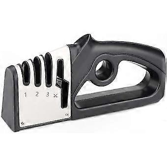 Good Quality Our knife sharpener is made from durable, eco-friendly materials. It features an ergonomic, non-slip ABS plastic handle and includes multiple sharpening stages with different abrasive surfaces for coarse and fine sharpening. High Safety The ergonomic design enhances safety during use. The secure grip allows you to sharpen knives effectively while keeping fingers away from the blade. This sharpener helps maintain the longevity of your knives. 4-in-1 Upgrade The sharpener includes four compartments, one designed for scissors. It offers three stages of manual sharpening using diamond, tungsten carbide, and ceramic abrasives, suitable for ceramic and stainless steel knives to restore a sharp edge. Easy to Use Lightweight and compact, the sharpener has a rubber base to prevent slipping, ensuring stability during use. It is easy to operate, suitable for both right- and left-handed users, and saves space.