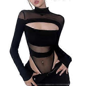 Women's See Through Mesh Striped Long Sleeve Bodysuit Hollowed Out Backless Skinny Leotard Sheer T-Shirt Top Clubwear Black S