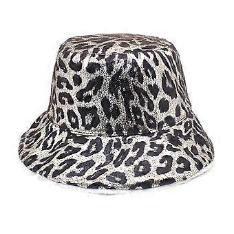 Bucket Hat Pu Leather Made Winter Hats Leopard Pattern Covered Fisheman Hats with Sunday Angora Yarns Made Lining silver