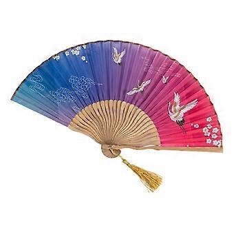 Chinese Style Vintage Handheld Folding Fan With Tassel Crane Flower Printed Pattern For Wedding Dancing Party Cheongsam