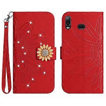 Compatible With Samsung Galaxy A10S Embossed Sunflower with Diamonds Magnetic Card Holder Wallet Phone Case with Short Strap