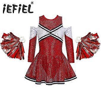 Kids Girls Cheerer Costume Uniform Sets Off-shoulder Shiny Sequins With 1 P Flower Set For Cheer