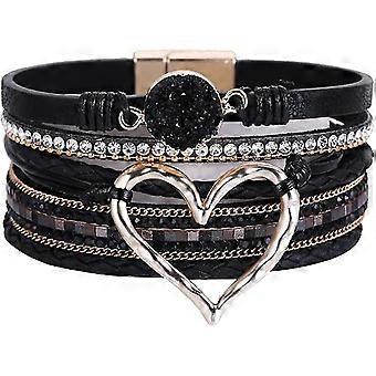 Leather Wrap Bracelet Heart Layered Bracelet Wide Cuff Bangle Boho Bracelets With Magnetic Clasp Black Man Jia-Yvan