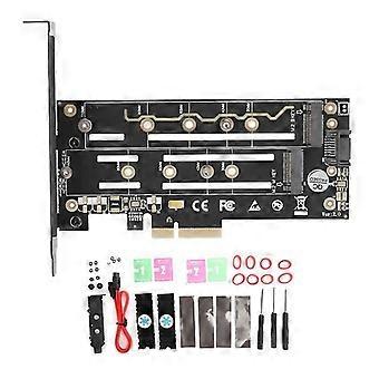 Feature: 1. Supports 1 M.2PCIe SSD (NVMe or AHCI) and 1 M.2 SATA 6Gbps SSD simultaneously. 2. Support PCIEM.2 SSD (NVMe or AHCI, Key-M), PCIE 3.0 X4 32Gbps bandwidth. 3. Support SATA based M.2 SSD (Key-B/B+M), SATA 6Gbps bandwidth. 4. Supports PCIe Gen3 and PCIe Gen2 M.2 NGFF 110mm, 80mm, 60mm, 42mm, 30mm SSD. 5. 24 X 5 hole copper PCB for efficient ventilation and heat dissipation, including 2 heat sinks. 6. Transparent to the operating system, no drivers required, compatible with PCI-E 3.0 39Gbps standard. Specifications: Item Type: Adapter Card Support PCIe1.0, PCIe 2.0 and PCIe 3.0 Motherboards Support SATA-based M.2 SSD (Key-B/B+M), SATA 6Gbps bandwidth Size: approx. 144mm/5.7in 58mm/2.3in Package List: 1 x SSD Adapter Card 1 x Bracket 2 x Aluminum Radiator 4 x Thermal Silica Pad 8 x Silicone Ring 1 x SATA Cable 3 x Screwdriver 1 x Screw Kit 3 x Manual Instructions for use 2 x wipe pack 4 x screws Note: 1.Please remember that if you want to read the M.2 SATA SSD (B key), you need to connect a 7 pin SATA cable to the motherboard. (SATA cable is included) 2.Please remember that this adapter only supports PCIe X4 X8X16 slots. PCIe X1 slot is not supported.